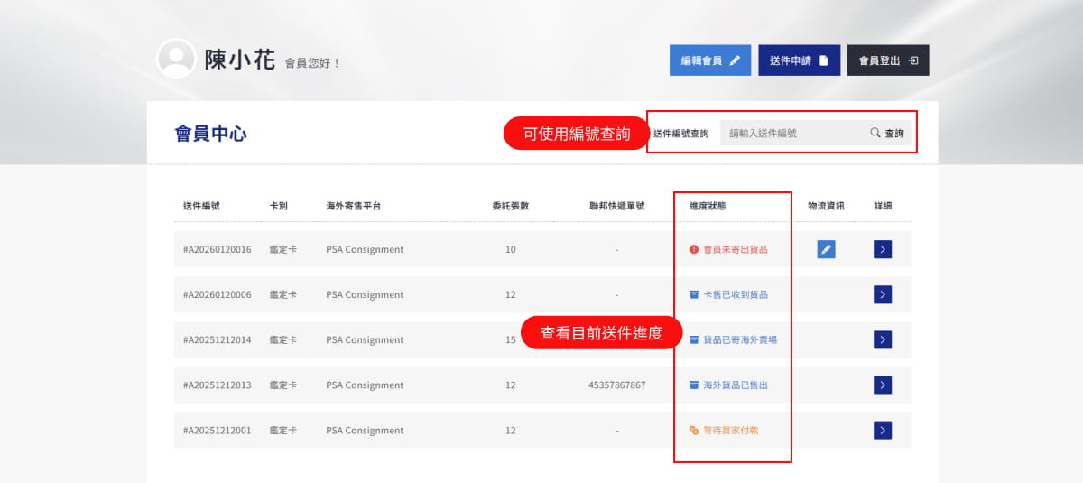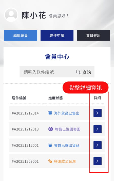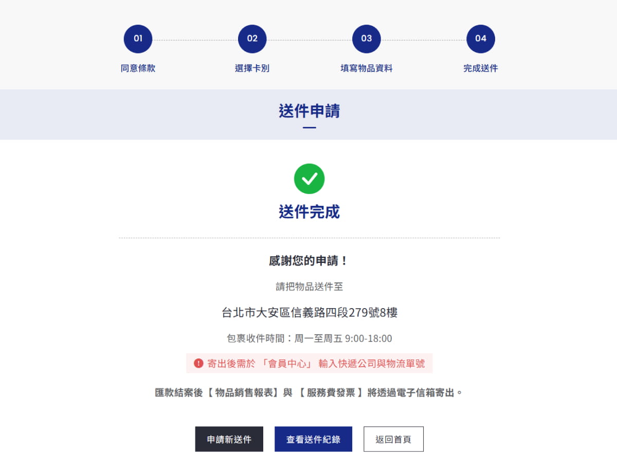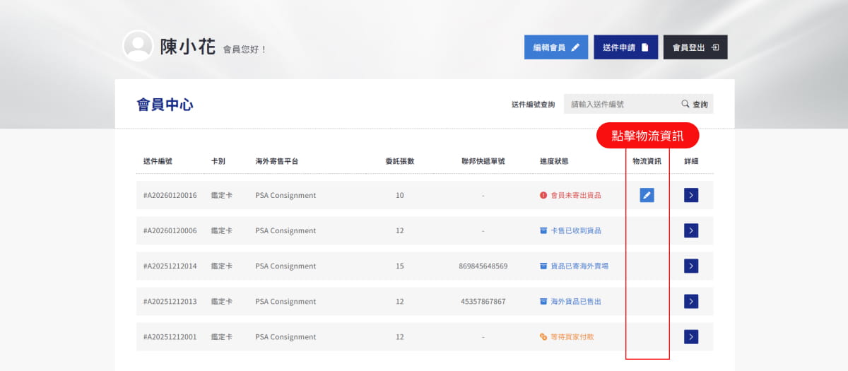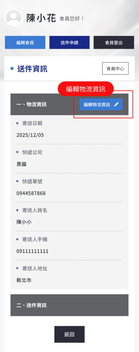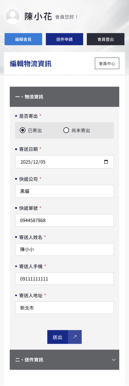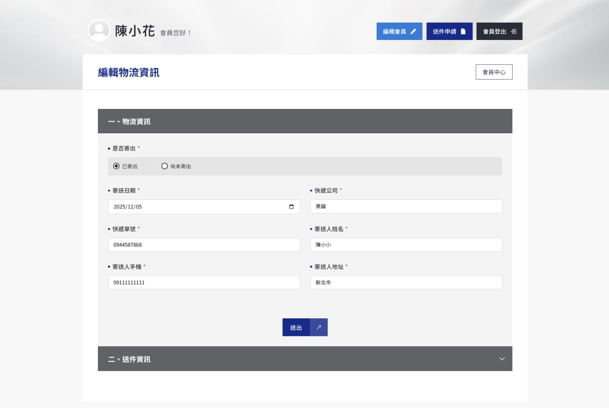 寄出卡片後,回到會員中心填寫物流資訊。